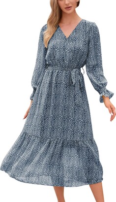 Yuargli Floral Dresses For Women Women Boho Dress Floral Print Long Sleeve Wrap V Neck Pleated Belt A Line Flowy Maxi Dress Casual Party Bohemian Flowy Long Dress For Ladies Blue